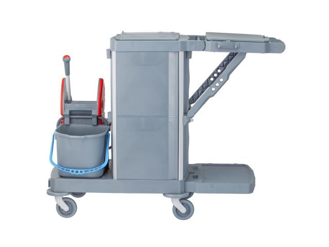 Dva 15 l kbelíky s červenými a modrými rukojeťmi a ždímačem PREXA Uzamykatelná přední dvířka – zabezpečují obsah vozíku Dvířka se otevírají o 270° pro snadný přístup a ovládání Vnitřní prostor vybaven dvěma…