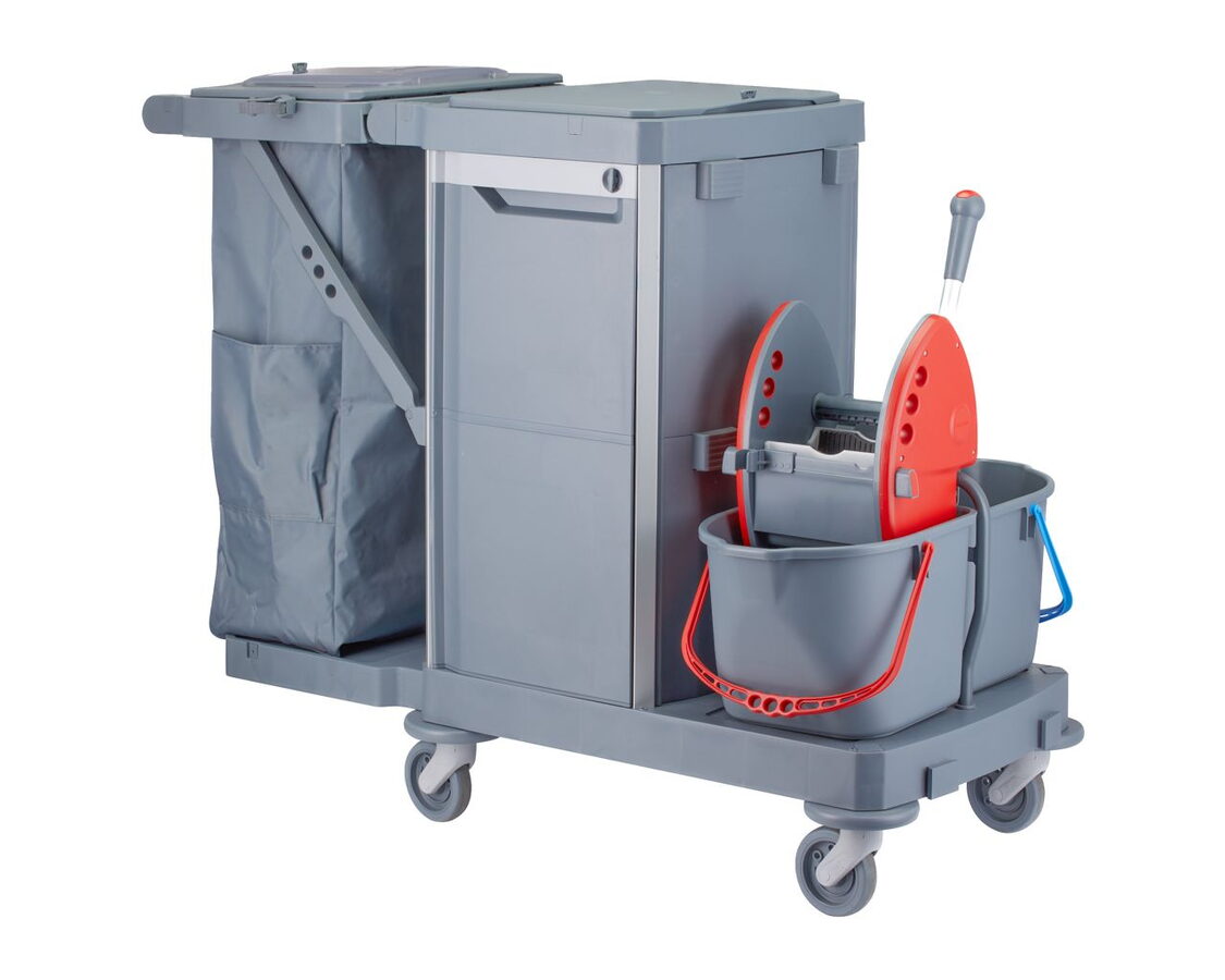 - Úklidový servisní vozík MERIDA, 2x15 l dvoukbelíkový systém s červeným ždímačem, 40 l box, 3x7 l vědra